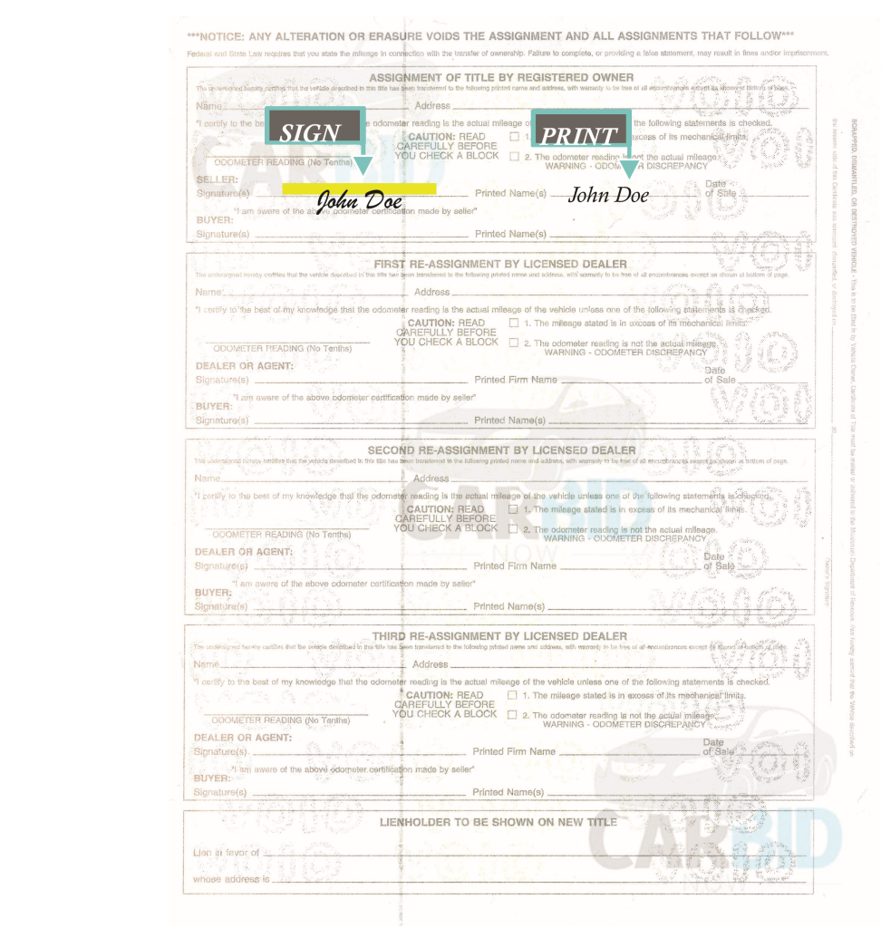 - The Owner(s) must PRINT THEIR FULL NAME on the back where it reads “Printed Name(s) of Seller(s).” Please use your FULL name exactly as it appears on the title including any middle names, suffixes, or initials.