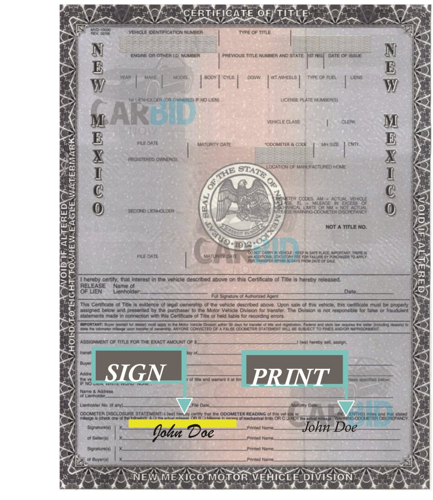 Your title may vary from the image above. If your title is not the same as the image shown here, the owner(s) must still sign and print on the correct “seller(s)” lines.